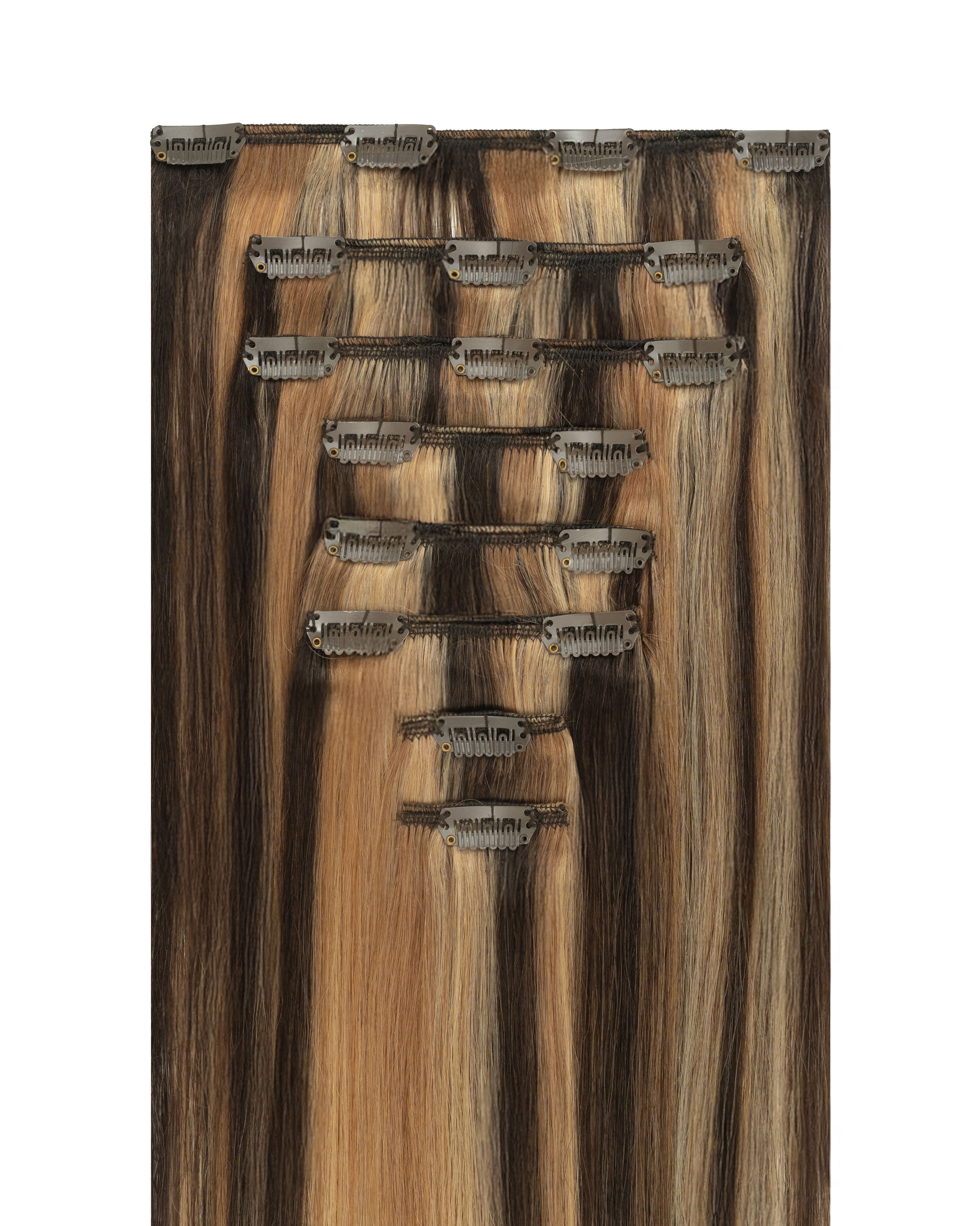 Classic clip-in extensions are a temporary hair enhancement solution designed for quick and easy DIY application. Each set typically includes multiple wefts of hair that vary in width and come with small, secure clips sewn onto the base. These clips snap open and closed, allowing users to attach them directly to their natural hair without the need for professional installation.